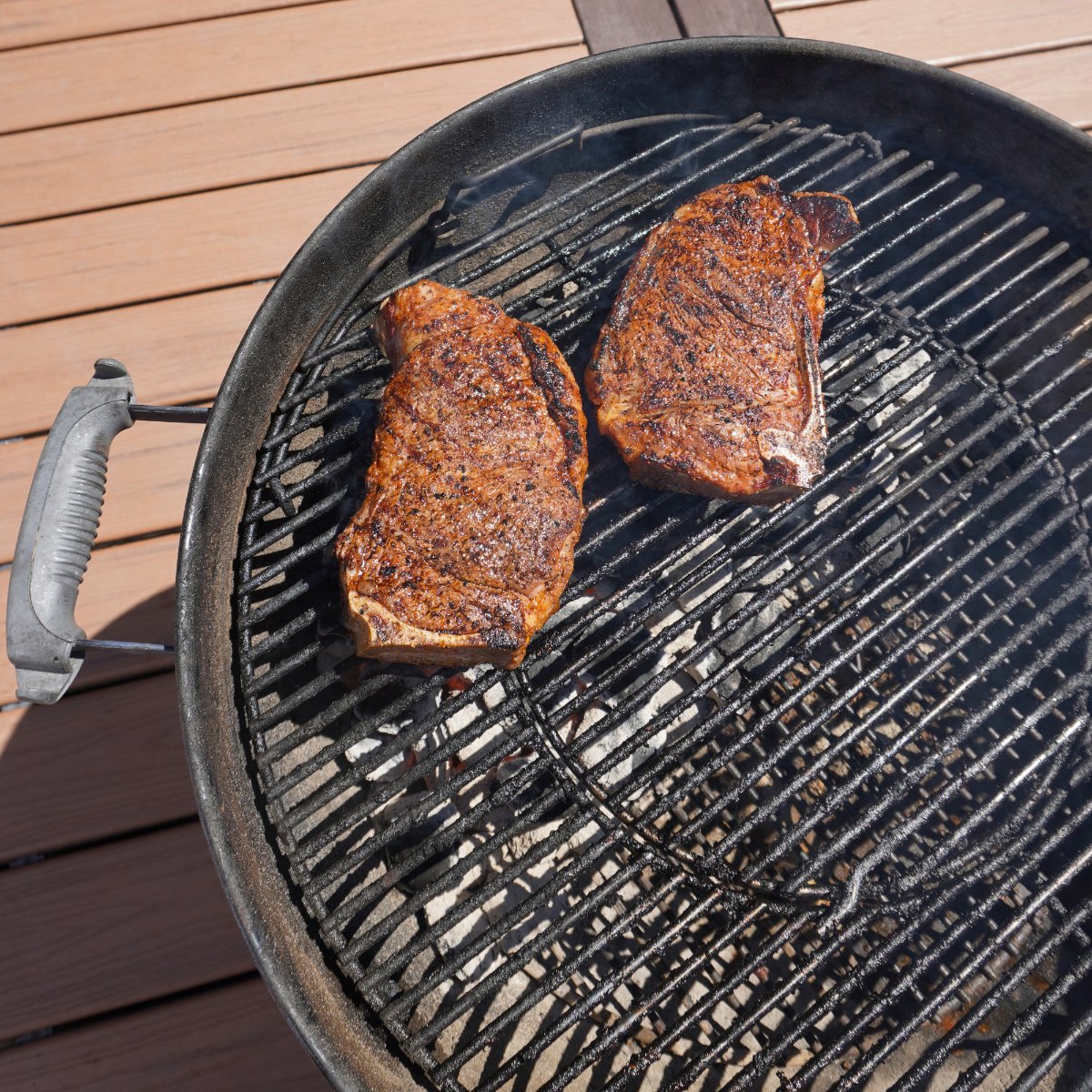 For this recipe I went with a New York strip. Before the steak goes on the grill, it is very important to get it to room temperature. Season all sides with seasoning and allow the meat to sweat. This process allows the salt to penetrate into the meat and absorb the water content which will then be released back into the meat once on the grill.