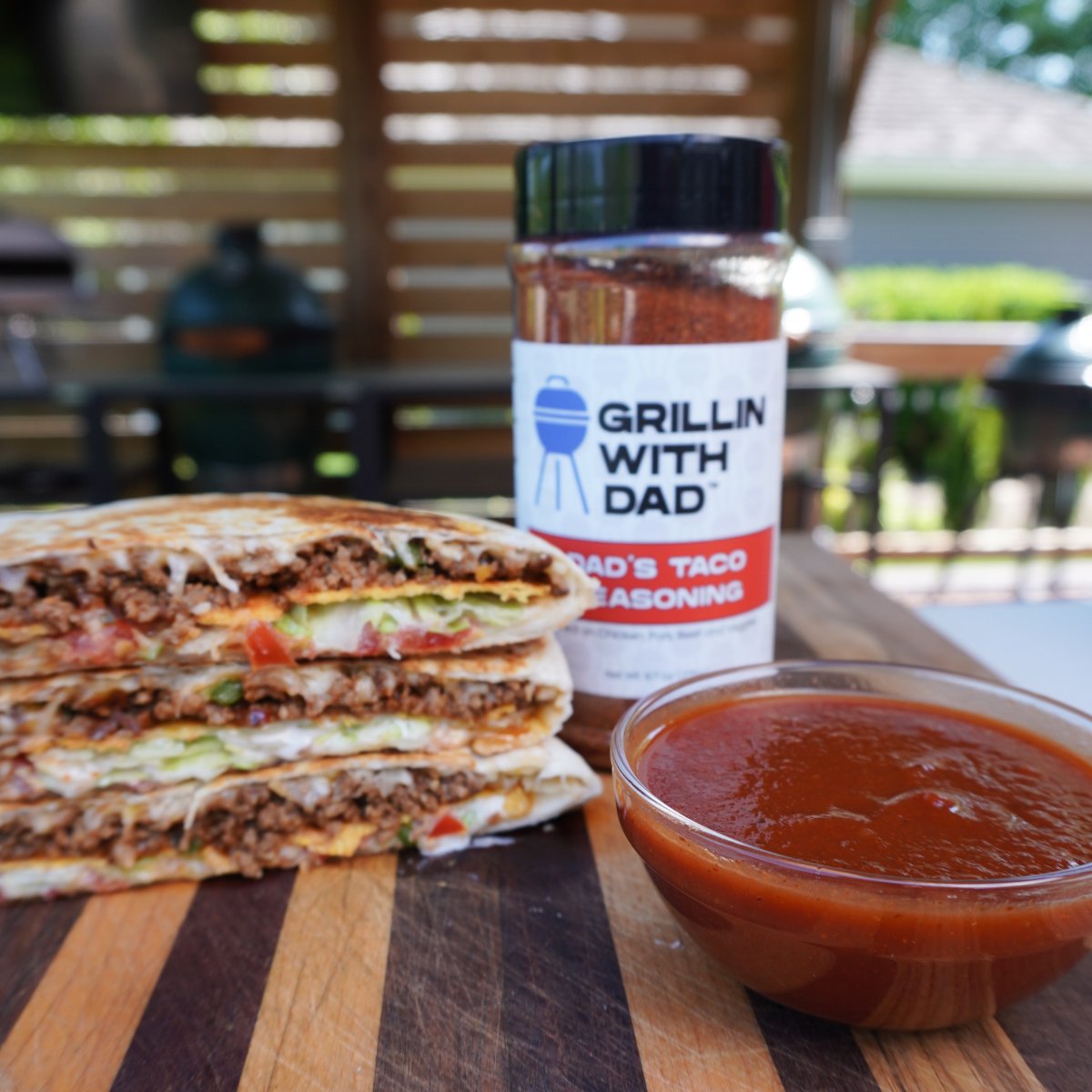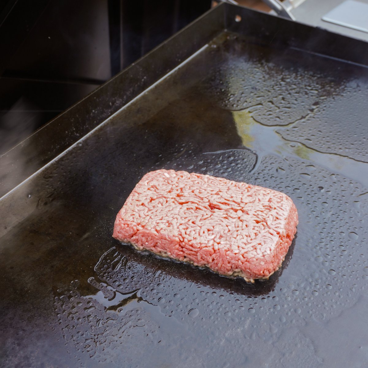 - Place the entire brick of beef on the hot surface and press down. Season the top with Dad'sTaco seasoning and flip once the crust is brown below. Repeat the process on the other side.