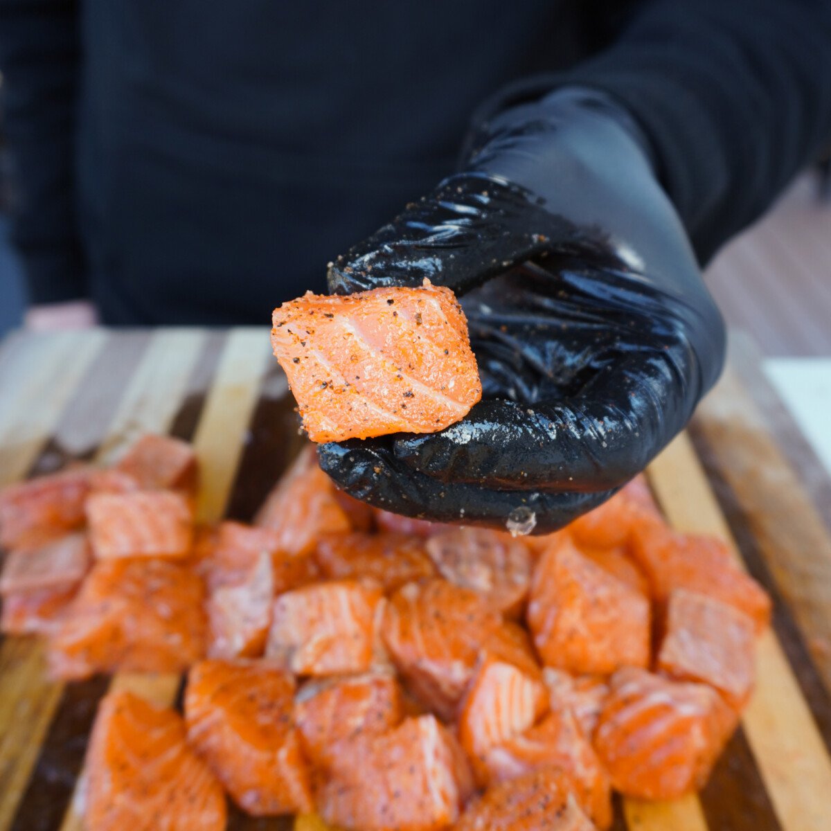 For the perfect uniform salmon bites, I highly recommend you purchase the center cut of the fish. This is the thickest part of the filet giving the cubes some height. It will also provide the most even sized bites which is ideal for even cooking.