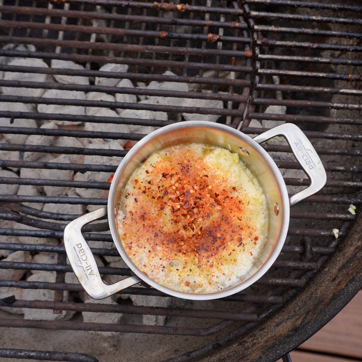 Next, in a saucepan, add butter, a lot of freshly minced garlic, Dad’s All Purpose rub. and a pinch of crushed red pepper flakes. Melt the butter over a low heat.